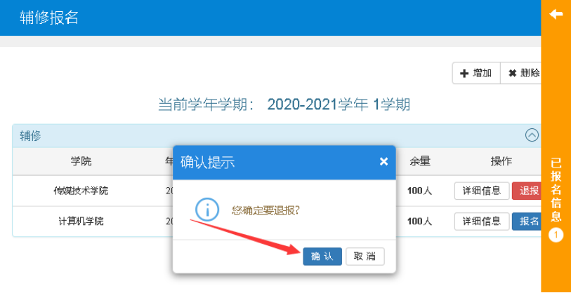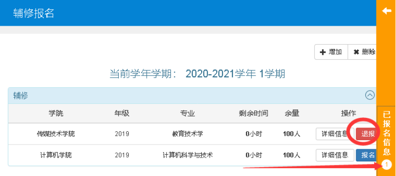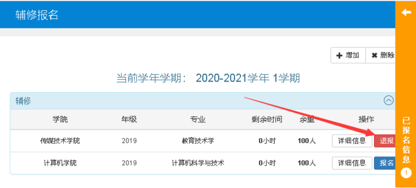 4.在辅修报名界面,申请辅修专业对应的按钮变为红色退报,点击已报名信息栏