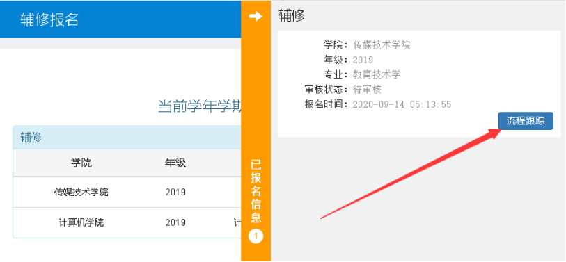 5.在辅修报名界面已报名信息栏,点击流程跟踪按钮